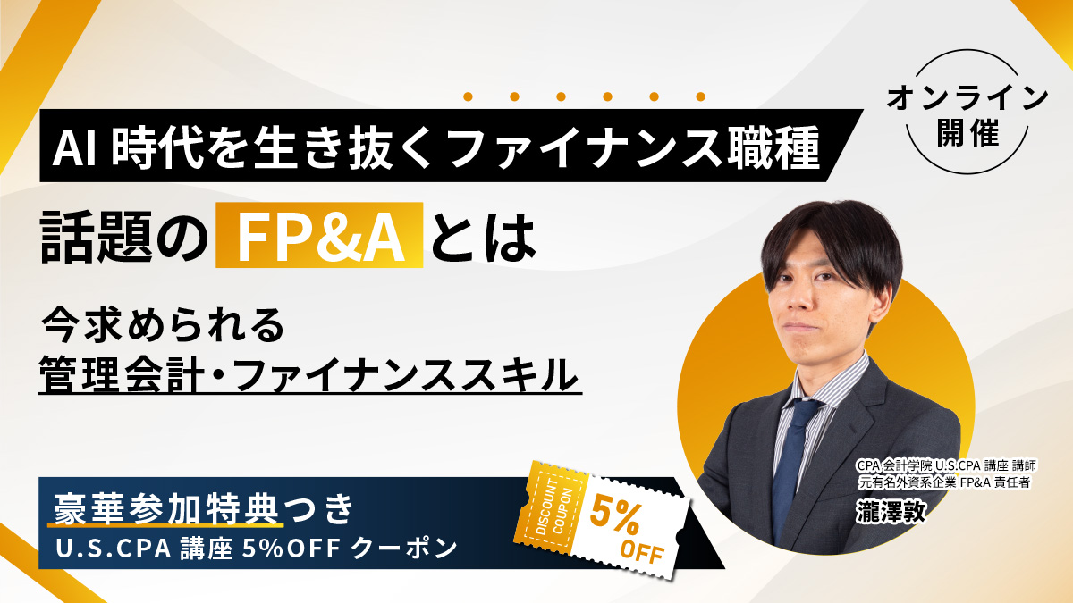 | 内容 | 企業の収益性改善のカギを握る「FP&A(Financial Planning & Analysis)」に焦点を当てたセミナーを開催します。 本セミナーでは、FP&Aの価値を多角的に紹介し、日本企業におけるFP&Aの役割や必要性、そしてキャリアとしての魅力を深掘りしていきます。 【参加特典】 ・U.S.CPA講座 5%OFF割引クーポン 【開催場所】 オンライン |