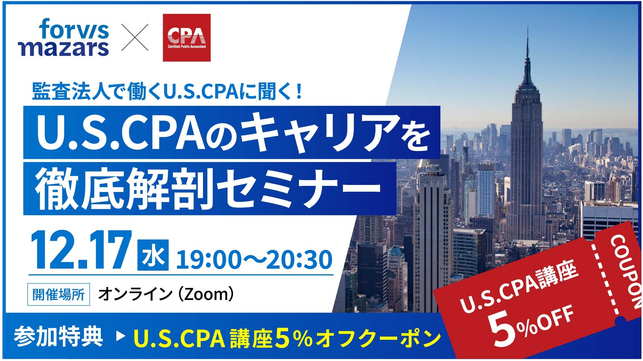 | 内容 | ・日時 2025年12月17日(水) 19:00~20:30 ・形式 オンライン(Zoomウェビナー形式) ・対象者 U.S.CPA資格に興味のある方、U.S.CPA講座の受講を検討されている方 |