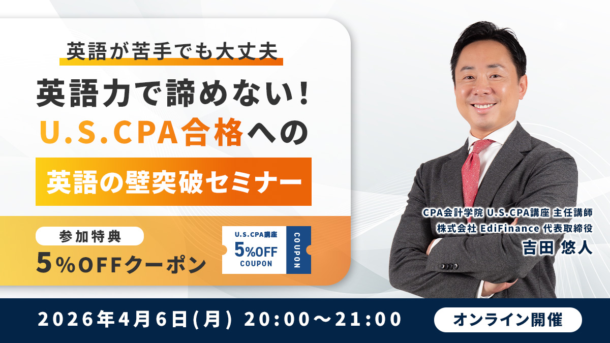 | 内容 | ・日時 2026年4月6日(月) 20:00~21:00 ・形式 オンライン(Zoomウェビナー形式) ・対象者 U.S.CPA資格に興味のある方、U.S.CPA講座の受講を検討されている方、英語に不安のある方 |