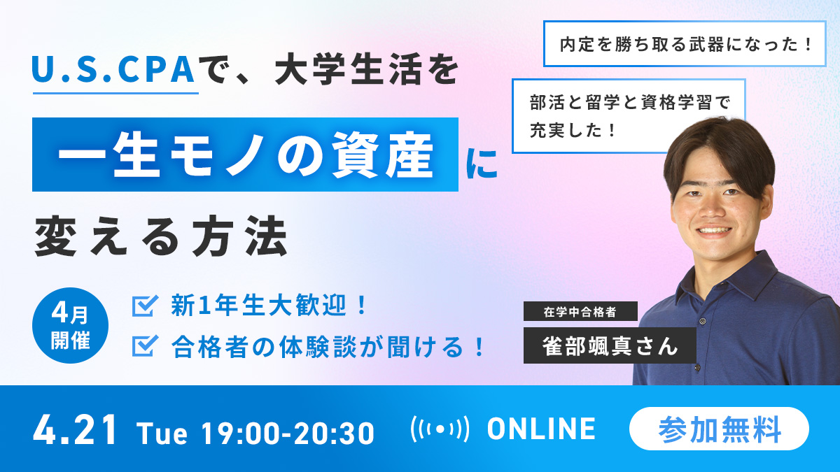 本セミナーでは、世界基準のビジネス資格「米国公認会計士(U.S.CPA)」を武器に、大学生活を賢くアップデートした先輩たちの実体験を交えながら、その秘訣を公開します。